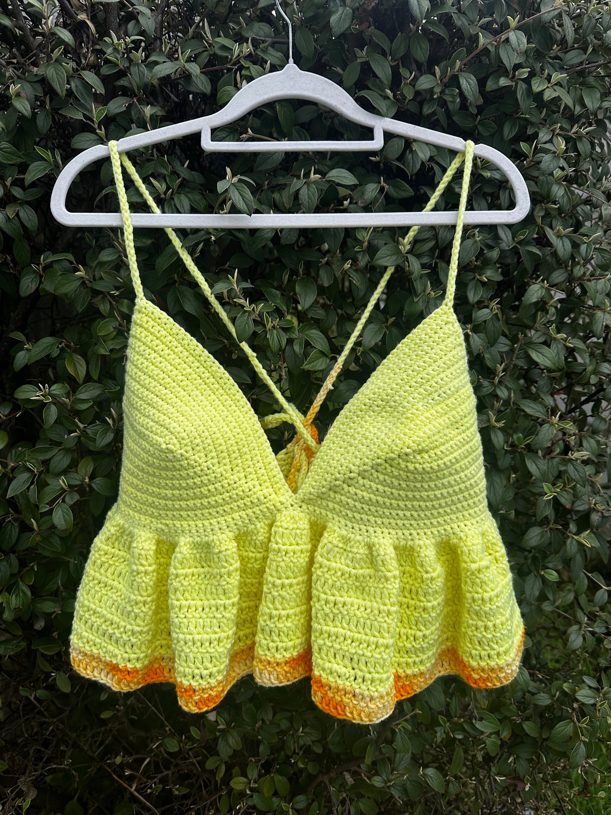 This cute ruffle top is made to fit a size Large- Xlarge and made for a DD-E cup. Made with lightweight acrylic this little number is sure to and some flare to your next summer fit!