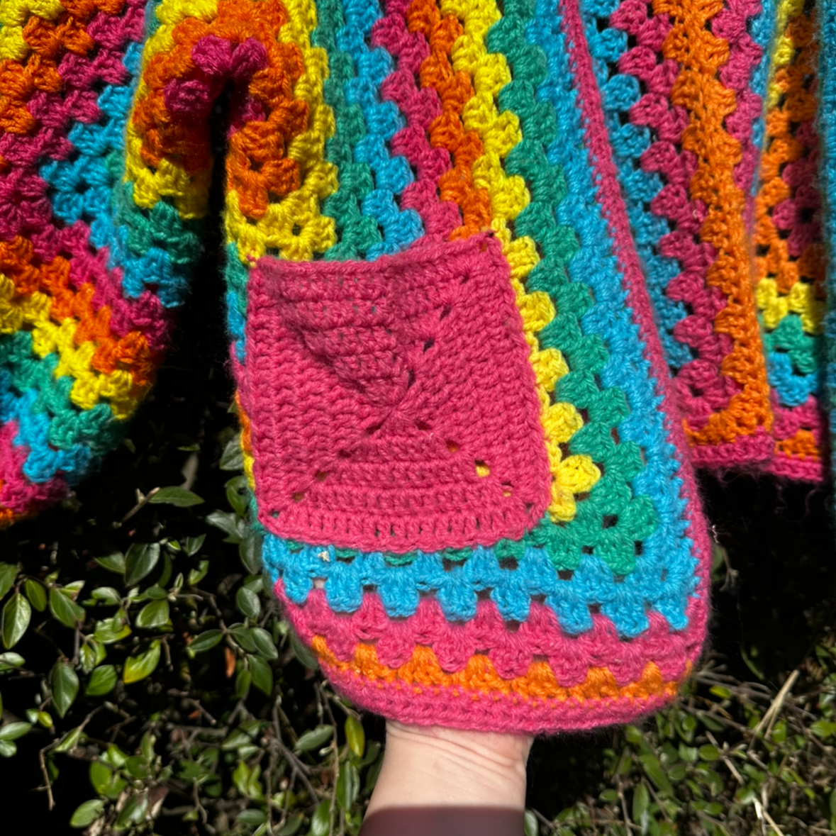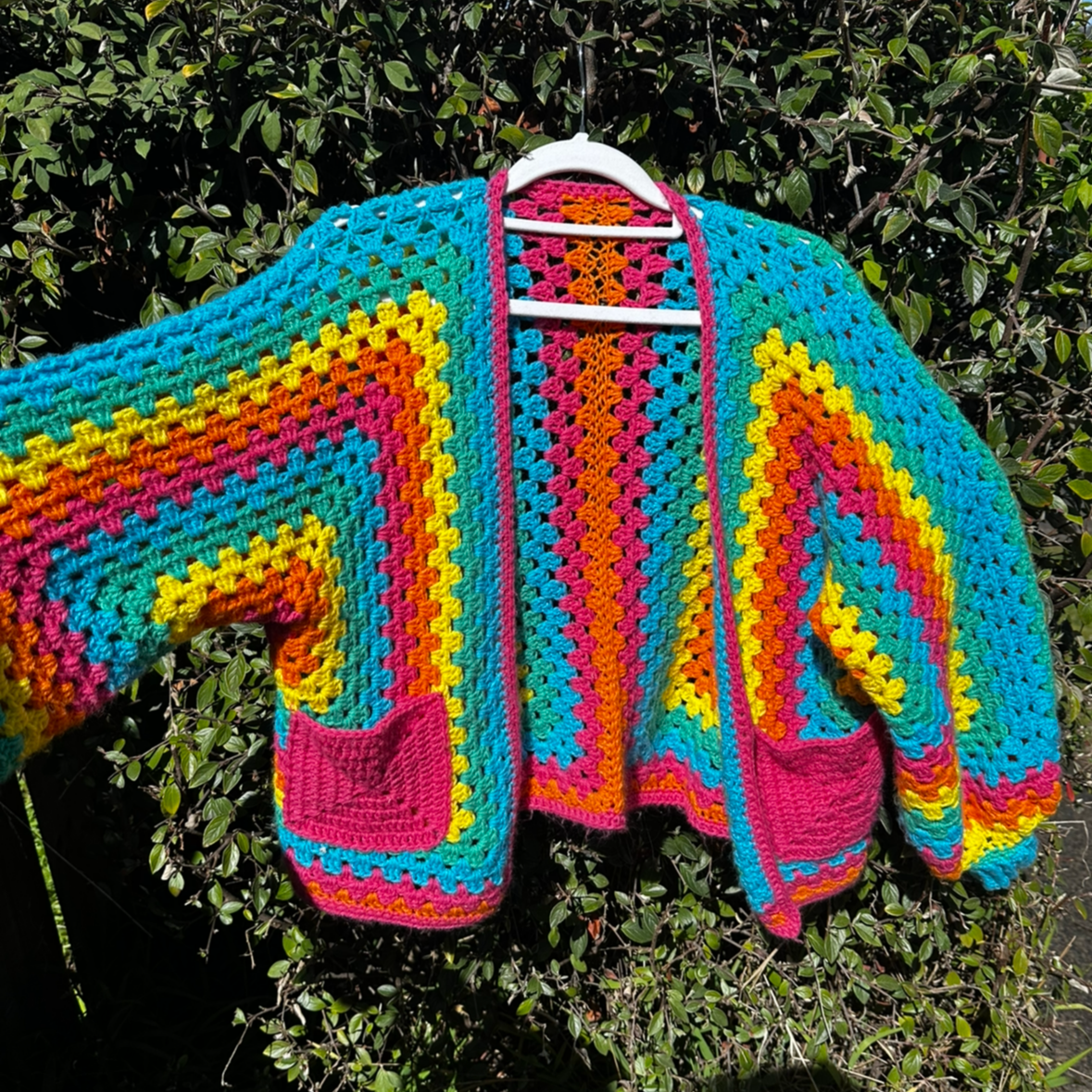This cardi is sure to turn heads when wore! What better way to express yourself than with this fun Rainbow Hexi-cardi! suited to fit children- teen sizes 10-16. Available in different colour combinations on launch days!